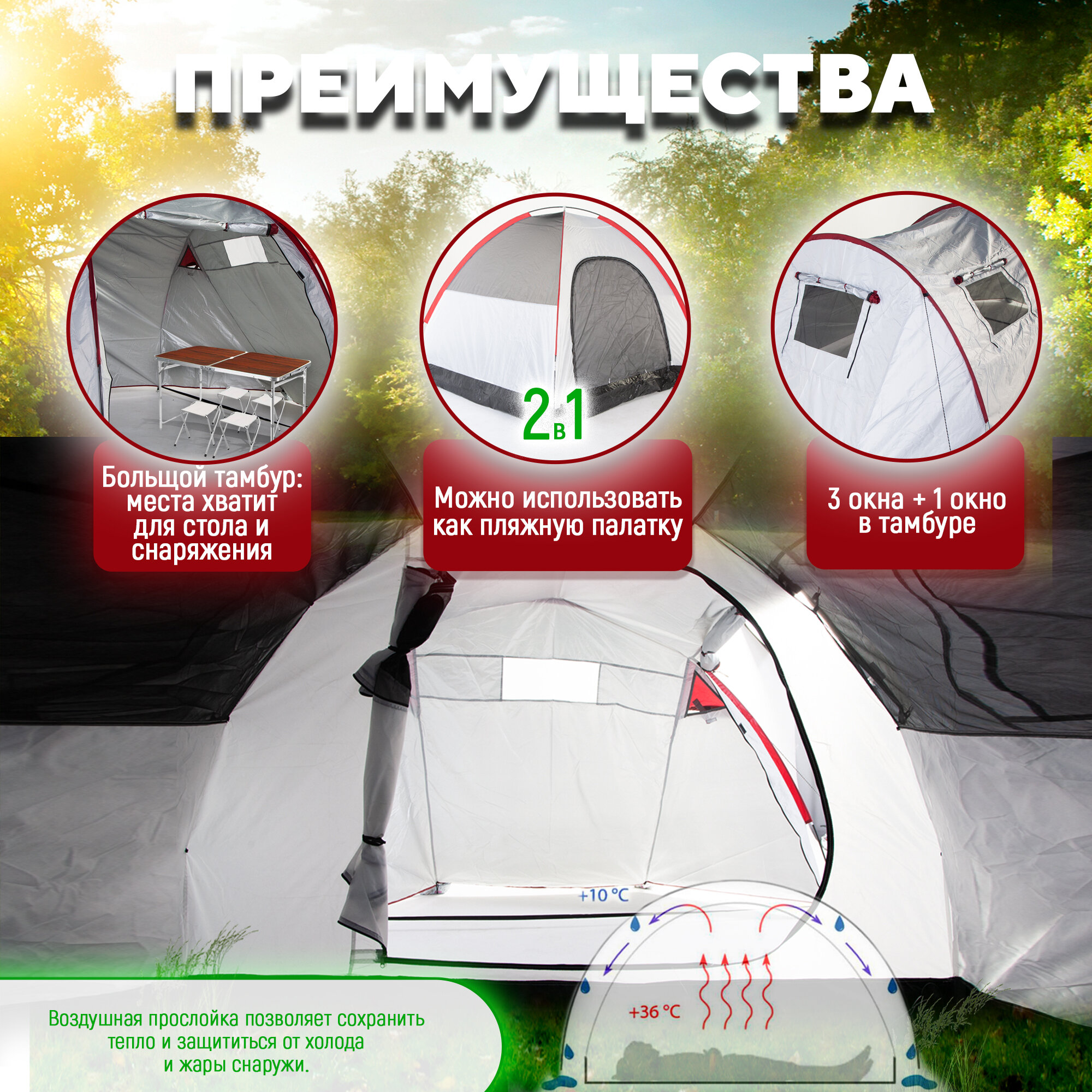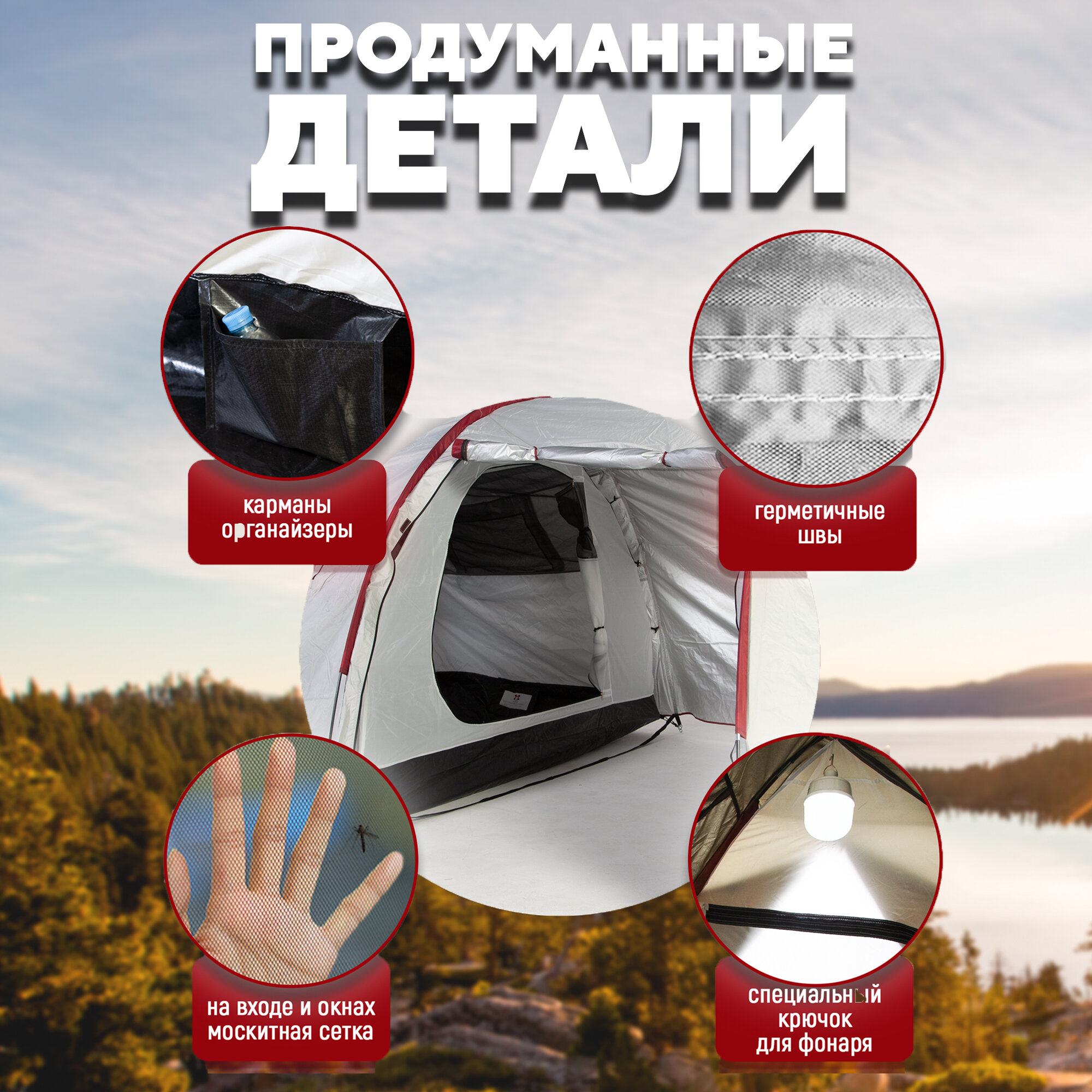| Особенности | внутренние карманы / проклеенные швы / вентиляционные отверстия / УФ-защита / окна / усиленные углы / ветрозащитная/снегозащитная юбка / навес / внутренняя палатка |