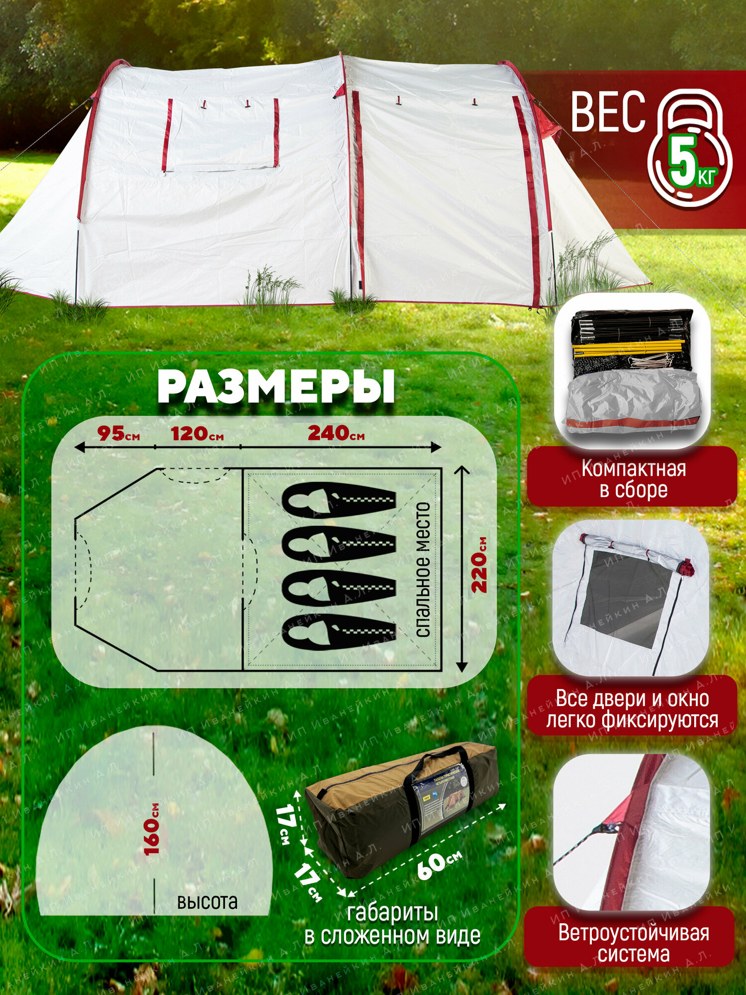 | Ширина внутренней палатки | 220 см |