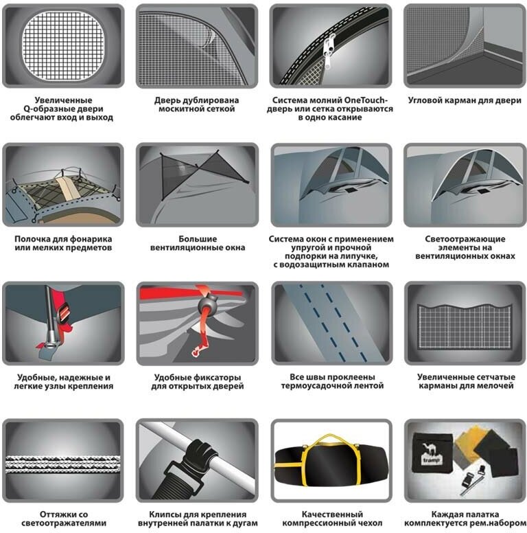 | Особенности | внутренние карманы / проклеенные швы / вентиляционные отверстия / УФ-защита / усиленные углы / огнеупорная пропитка / внутренняя палатка |