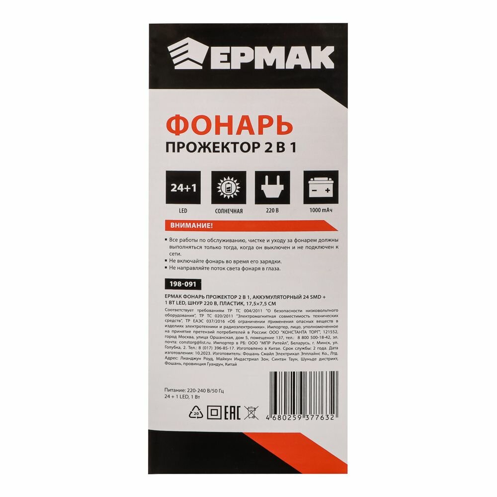 Ермак Фонарь прожектор 2-в-1 аккумуляторный 24 SMD + 1 Вт LED, шнур 220В, пластик, 17,5x7,5 см