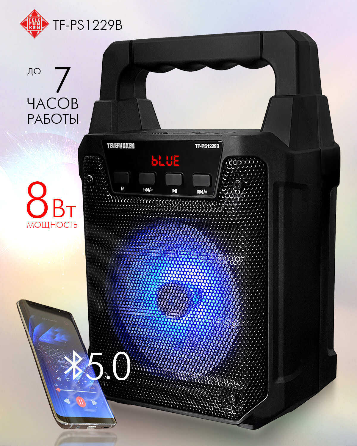 Ниже Вы можете прочитать отзывы на TELEFUNKEN Портативная колонка Telefunken TF-PS1229B, 8Вт, 1200мАч, FM, BT 5.0, microSD, USB, подсветка, ознакомится с подробными характеристиками, посмотреть интересные обзоры и фотографии на TELEFUNKEN Портативная колонка Telefunken TF-PS1229B, 8Вт, 1200мАч, FM, BT 5.0, microSD, USB, подсветка.
