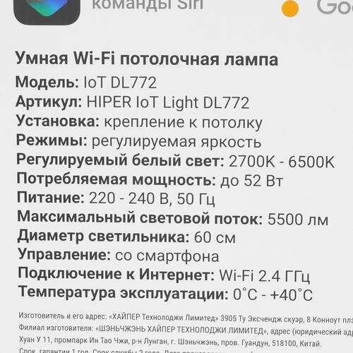 Умная потолочная лампа HIPER IOT Light DL772/Умная Wi-Fi LED потолочная лампа/Мощность:52Вт/Световой поток - 5500 лм/Регулируемый свет 2700K - 6500K/Вход: AC 220-240В, 50/60 Гц/Диаметр: 60 см/Поддержка HIPER IoT