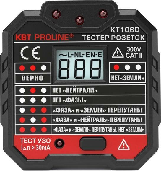 Тестер розеток и УЗО KT 106D серия PROLINE со светодиодной индикацией и ЖК-дисплей с указанием величины напряжения в сети, КВТ (79136)
