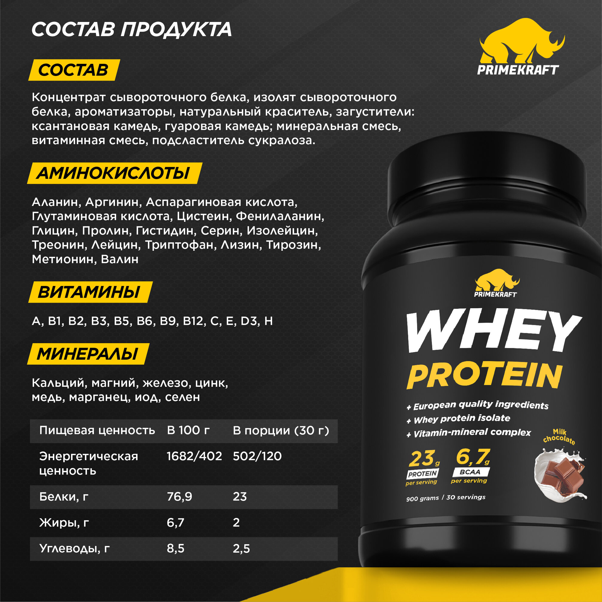 СохранитьПротеин сывороточный PRIMEKRAFT Whey Protein, Молочный шоколад (Milk chocolate), банка 900 г / 30 порций интересное: