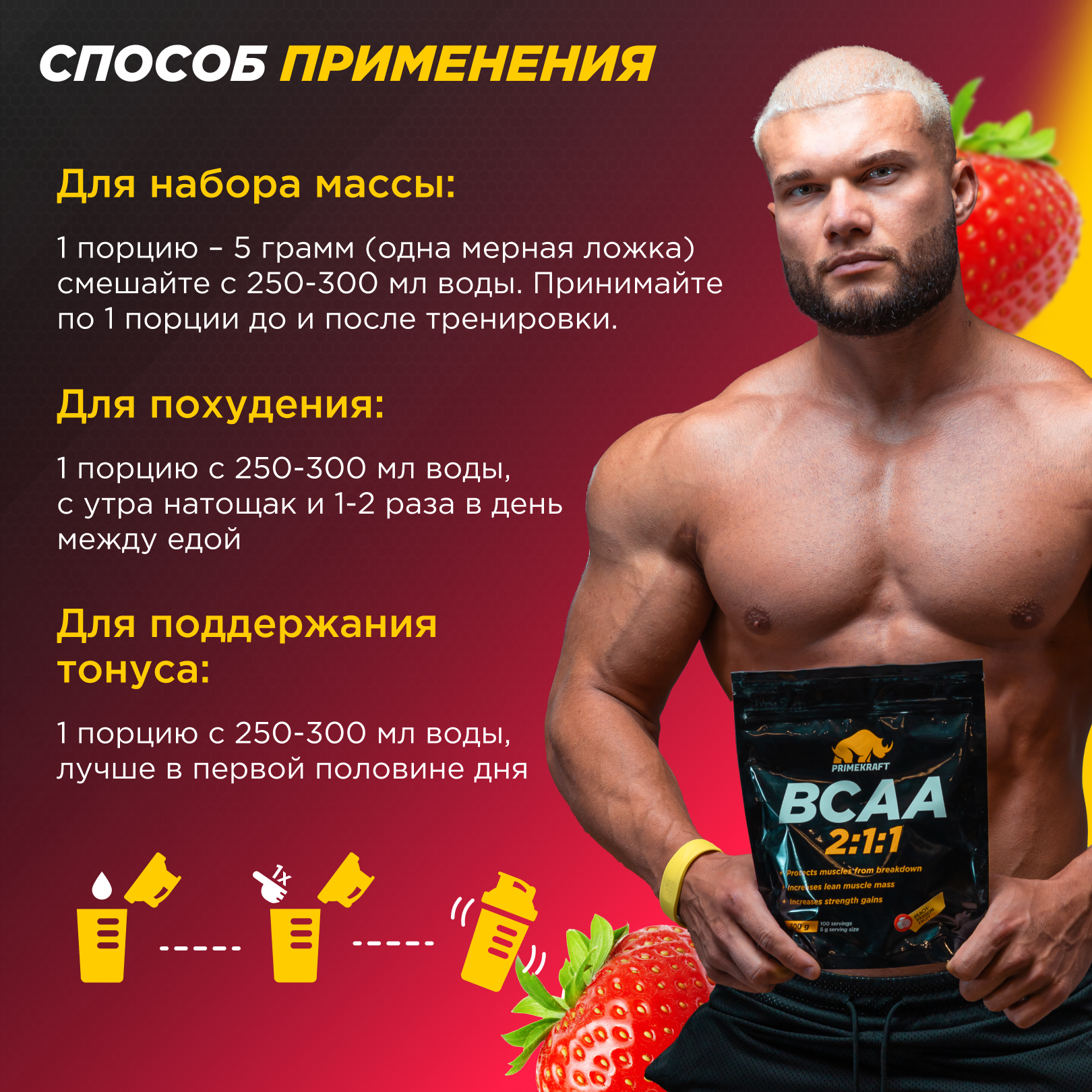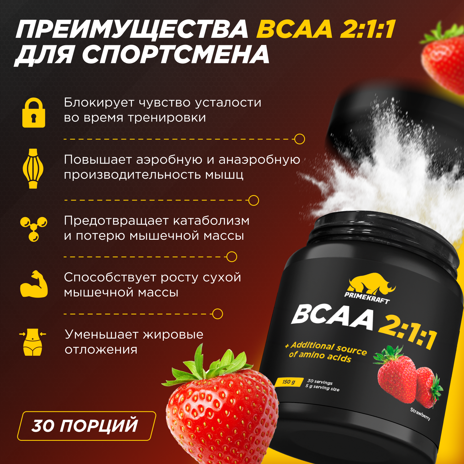 Prime Kraft BCAA - Аминокислотный комплекс 2:1:1 с клубничным вкусом, 150 г
