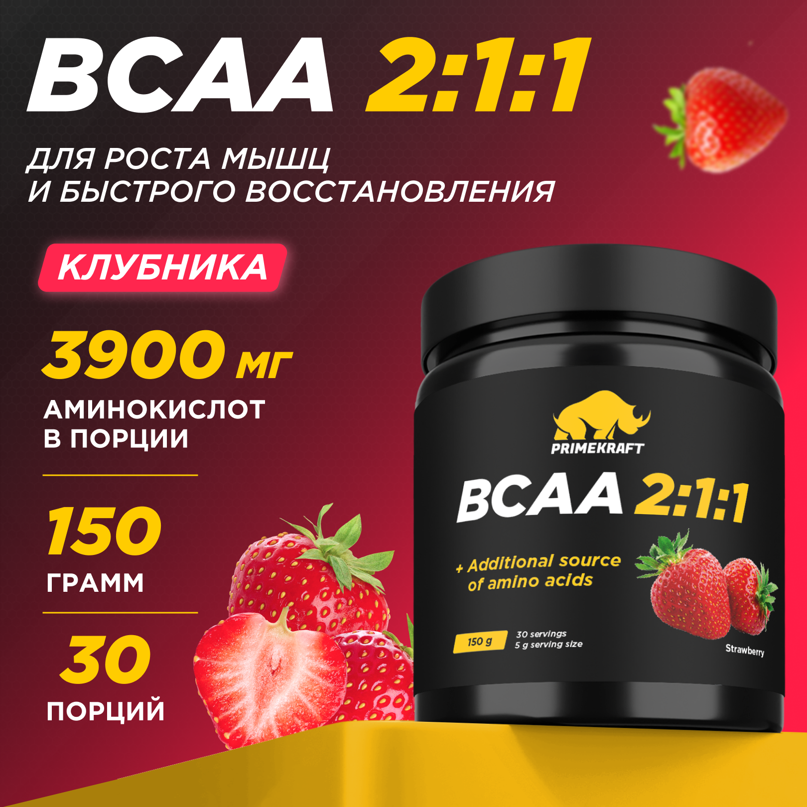 Купить Аминокислоты PRIMEKRAFT BCAA 2:1:1 (БЦАА) Клубника, 150 г / 30 порций