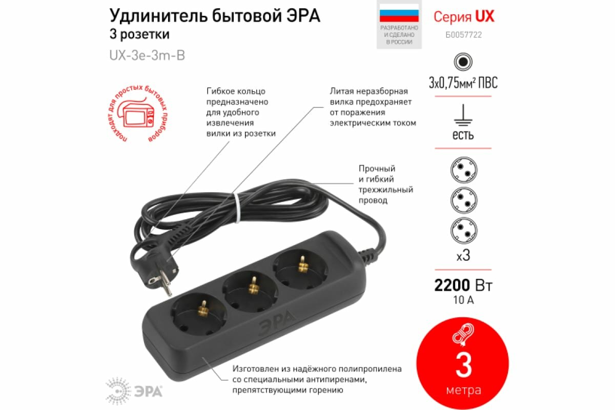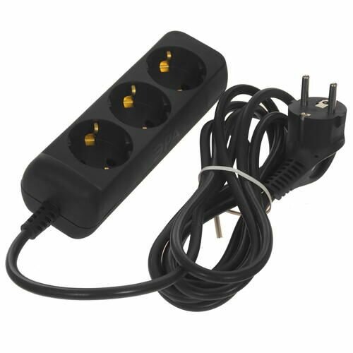Удлинитель электрический ЭРА UX-3е-3m-B с заземлением 3 розетки 3м ПВС 3х0,75мм2 10А черный (20/5/1) .