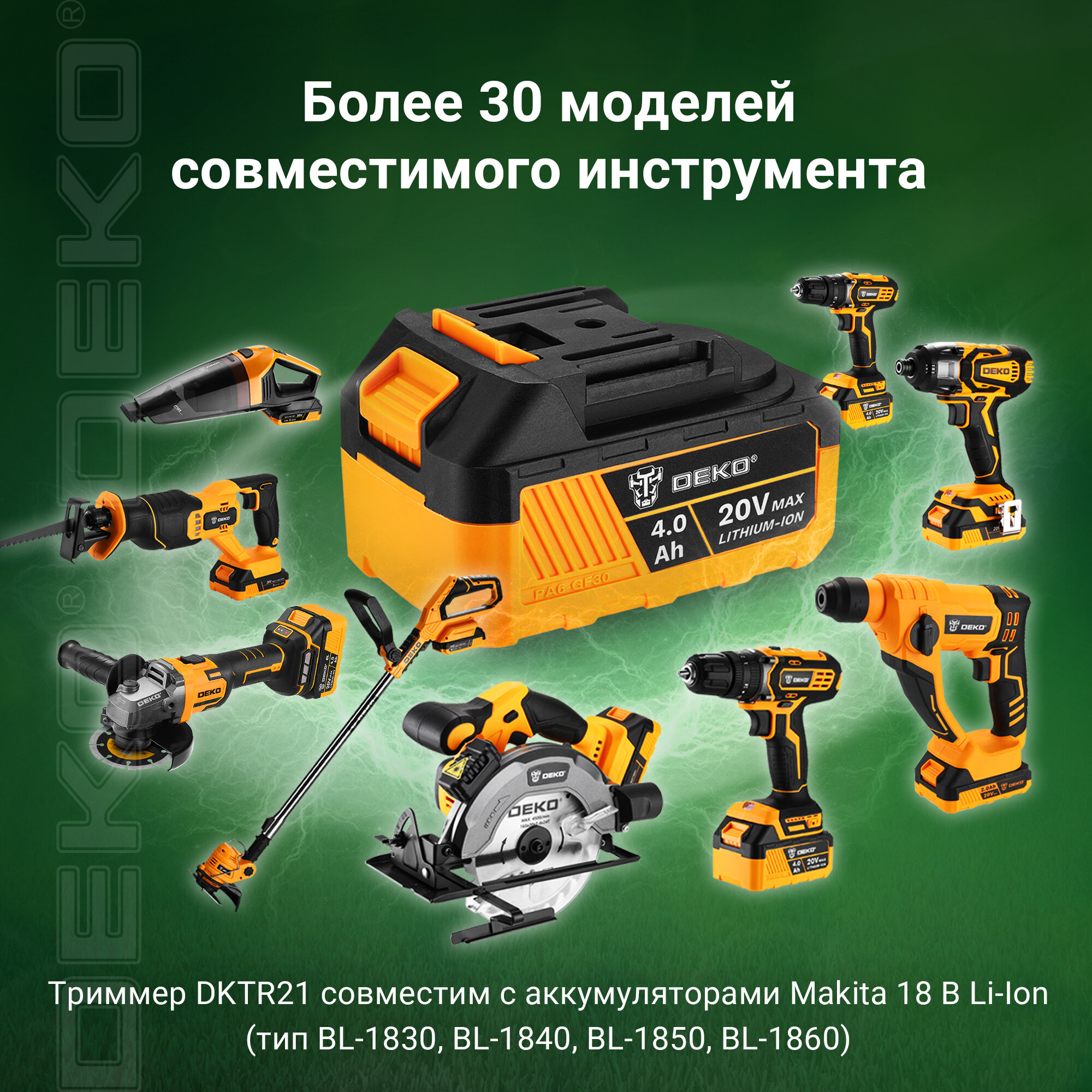 Триммер аккумуляторный Deko Dktr21, 2*2.0Ач зеленый