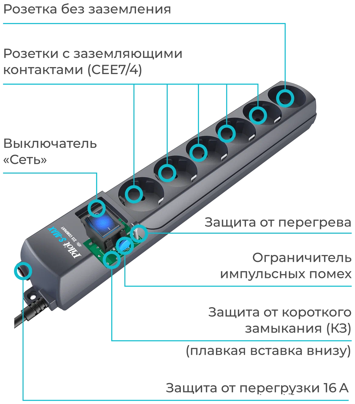 Сетевой фильтр Pilot S Max (5 евро + 1GP), 15А/3.5кВа, автомат, 7 м, графит ZIS Pilot S-Max (7 м, 6 розеток) (Pilot S-Max 7M)