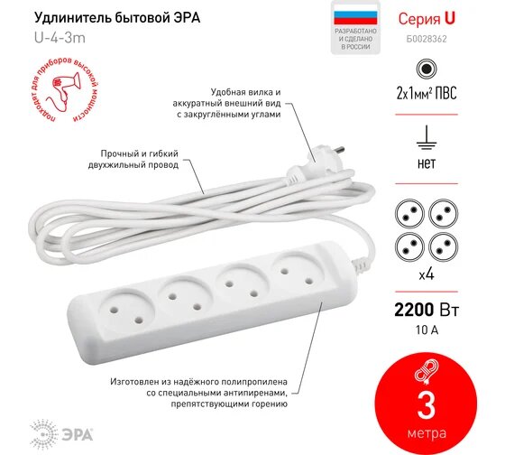 ЭРА U-4-3m Удлинитель без заземления., 4гн, 3м, ПВС, 2х1мм2, 10А интересное:
