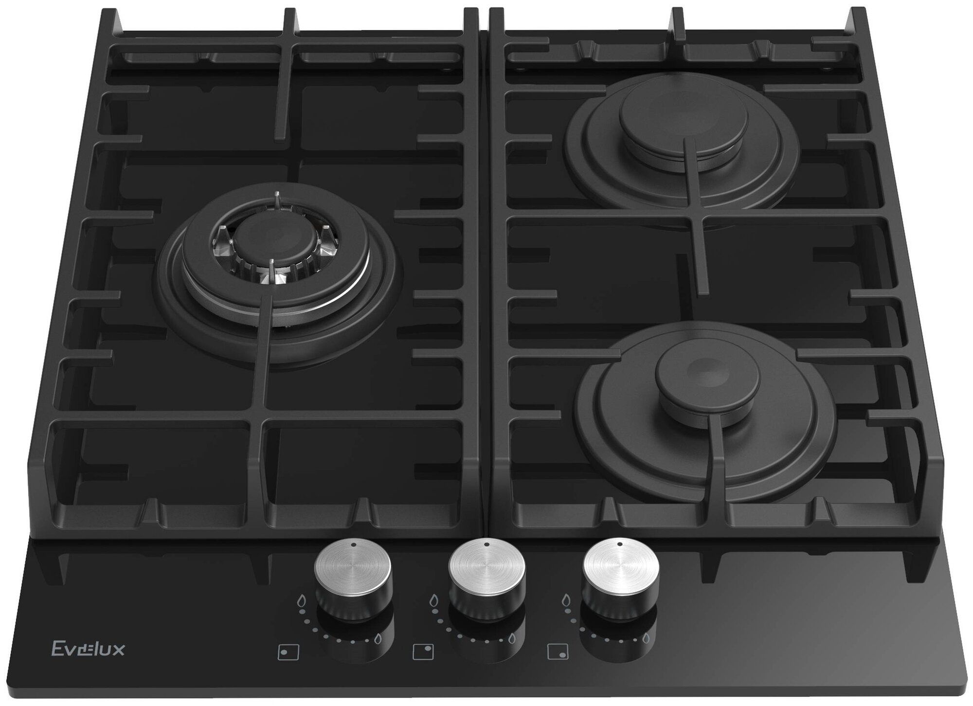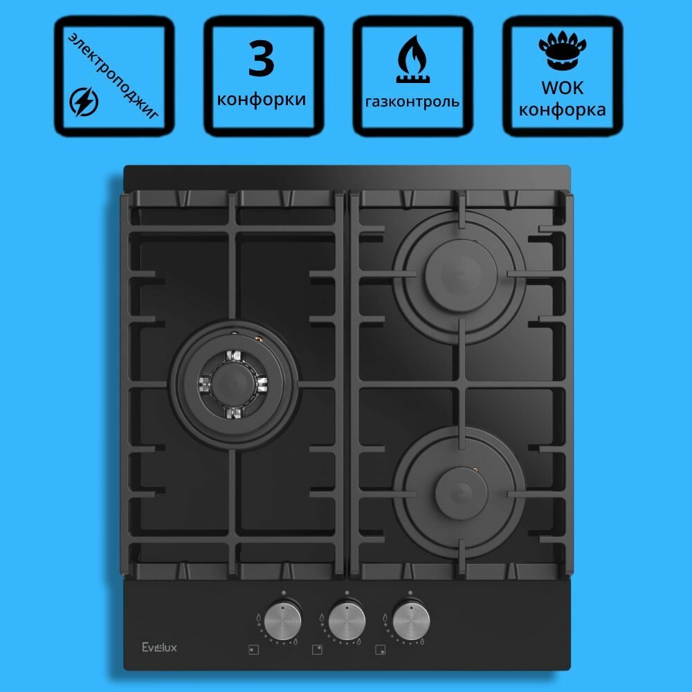 Газовая варочная панель Evelux HEG 450 WG, закаленное стекло, элетроподжиг, 3 конфорки, газ-контроль, чугунные держатели для посуды, WOK-конфорка, 45 см