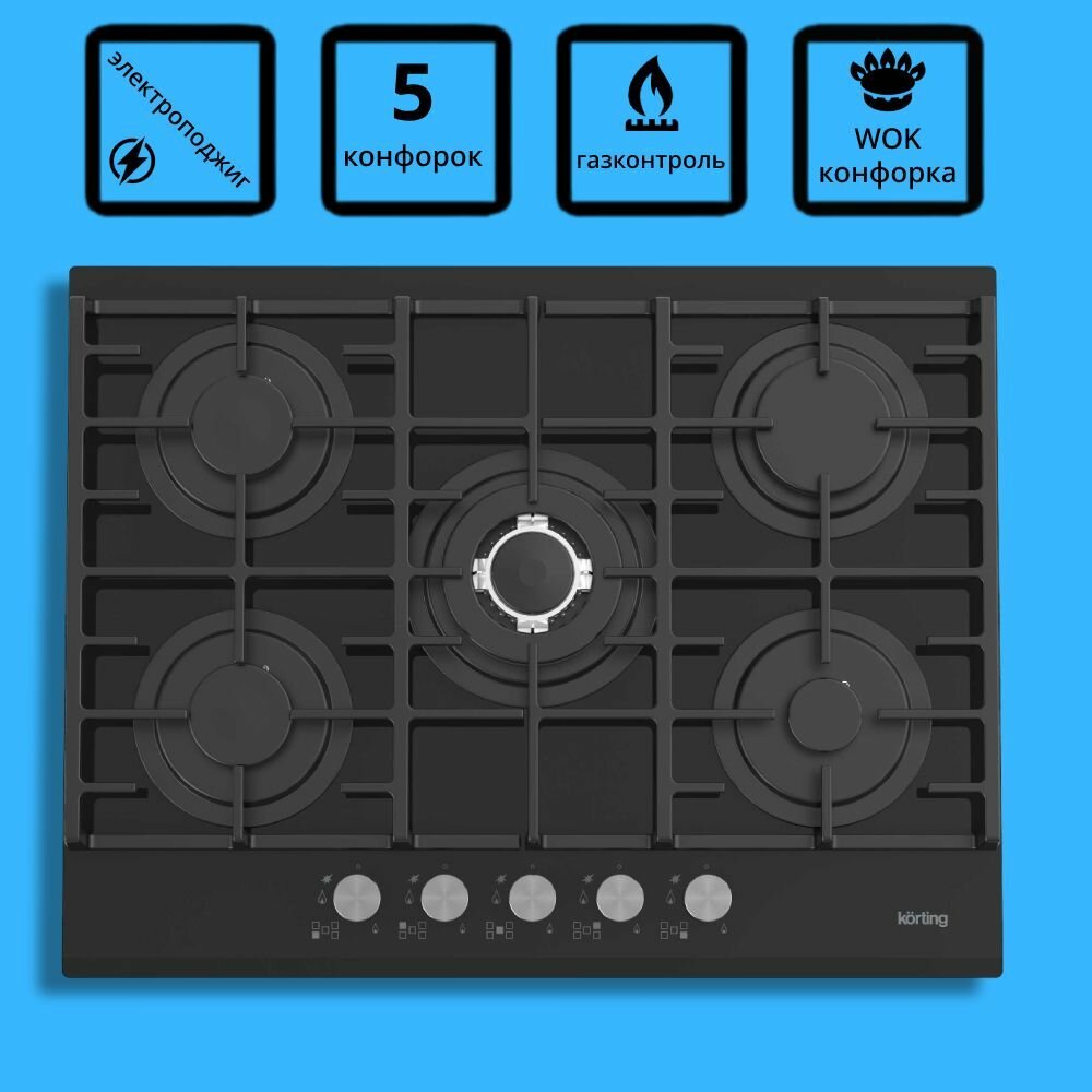 Встраиваемая газовая панель Korting/ Газовая варочная панель из закаленного стекла, ширина 70 см, 5 высокоэффективных конфорок, сверхмощная конфорка WOK 3,8 кВт, автоматический электроподжиг, газ-контроль каждой конфорки, передние металлические переключат
