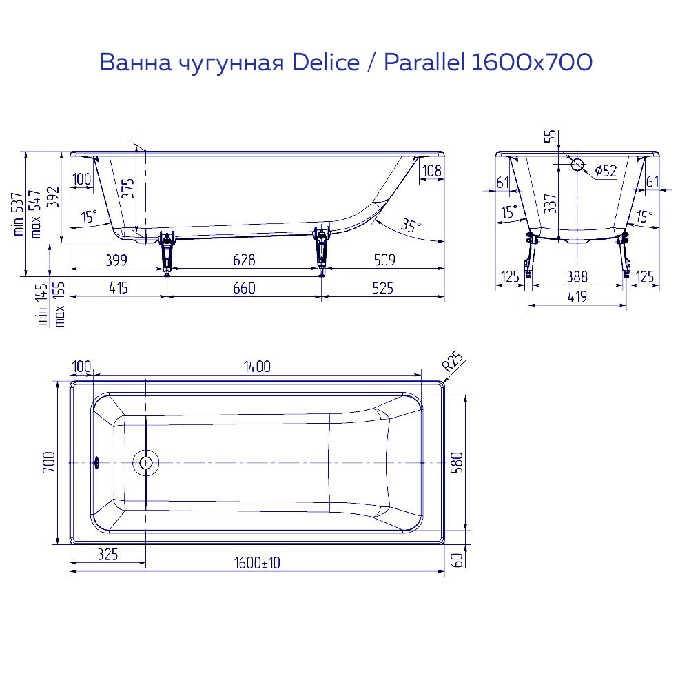 Чугунная ванна Delice Parallel 160х70 см DLR220504 белая, без ножек