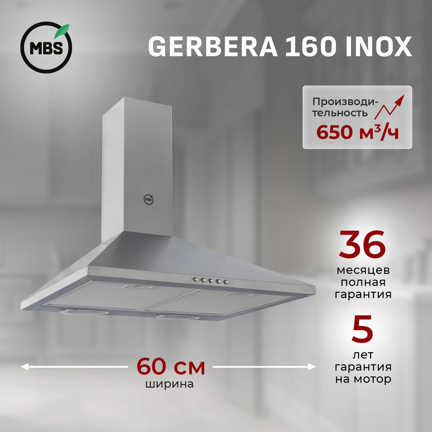 Кухонная вытяжка MBS GERBERA 160 INOX/60 см/производительность 650м3/ч, низкий уровень шума.