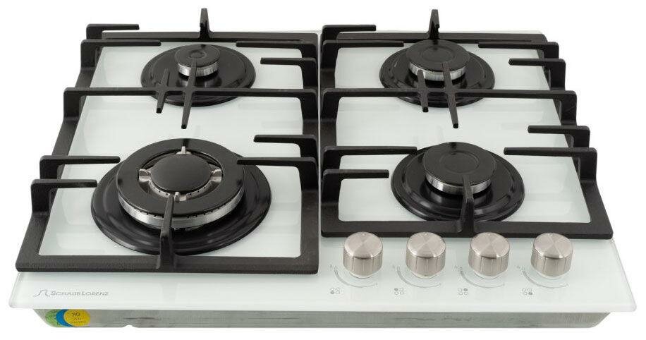 Варочная панель газовая встраиваемая Schaub Lorenz / Шауб Лоренц SLK GL6511 закаленное стекло белый 100х580х510мм 4 конфорки 2 решетки / газ-контроль / электроподжиг / газовая плита