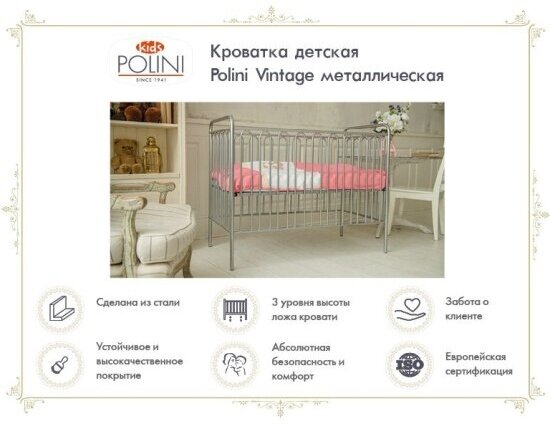 Кроватка Polini Vintage 110 металлическая, серебро интересное: