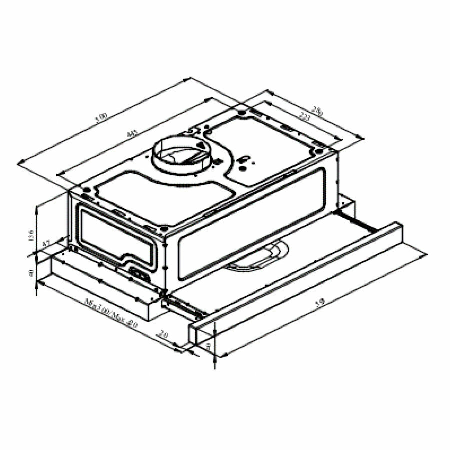 Встраиваемая Раздвижная Металлическая Панель Черная, 1 двигатель, ширина 60 см, Отвод/рециркуляция, 550 м3/час; 2-х ступенчатая регулировка скорости, 1 Wx2 шт LED лампы, 3-слойный алюминиевый фильтр, уровень шума 59 дБ