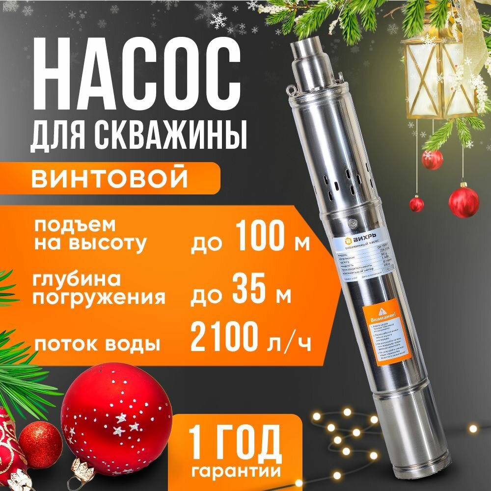 Скважинный насос вихрь СН-100B/3 // 1100Вт, 35 л/мин, диам. 75мм, кабель 20м, винтовой, для чистой воды из колодца, скважины с большой глубины / для сада и огорода и дачи