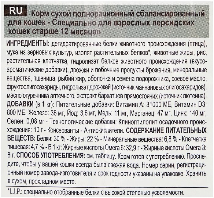 | Состав | дегидратированные белки животного происхождения (птица), мука из зерновых культур, изолят растительных белков*, животные жиры, рис, растительная клетчатка, гидролизат белков животного происхождения (вкусоароматические добавки), дрожжи и побочные продукты брожения, минеральные вещества, пшеница, рыбий жир, оболочка и семена подорожника, соевое масло, фруктоолигосахариды, гидролизат дрожжей (источник мaннановых олигосахаридов), масло огуречника аптечного, экстракт бархатцев прямостоячих (источник лютеина) |