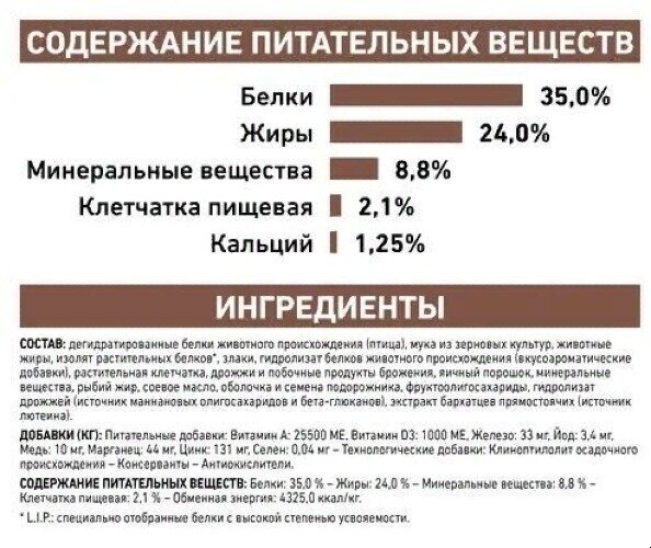 | Состав | дегидратированные белки животного происхождения (птица), мука из зерновых культур, животные жиры, изолят растительных белков*, злаки, гидролизат белков животного происхождения (вкусоароматические добавки), растительная клетчатка, дрожжи и побочные продукты брожения, яичный порошок, минеральные вещества, рыбий жир, соевое масло, оболочка и семена подорожника, фруктоолигосахариды, гидролизат дрожжей (источник мaннановых олигосахаридов и бета-глюканов), экстракт бархатцев прямостоячих (источник лютеина) |