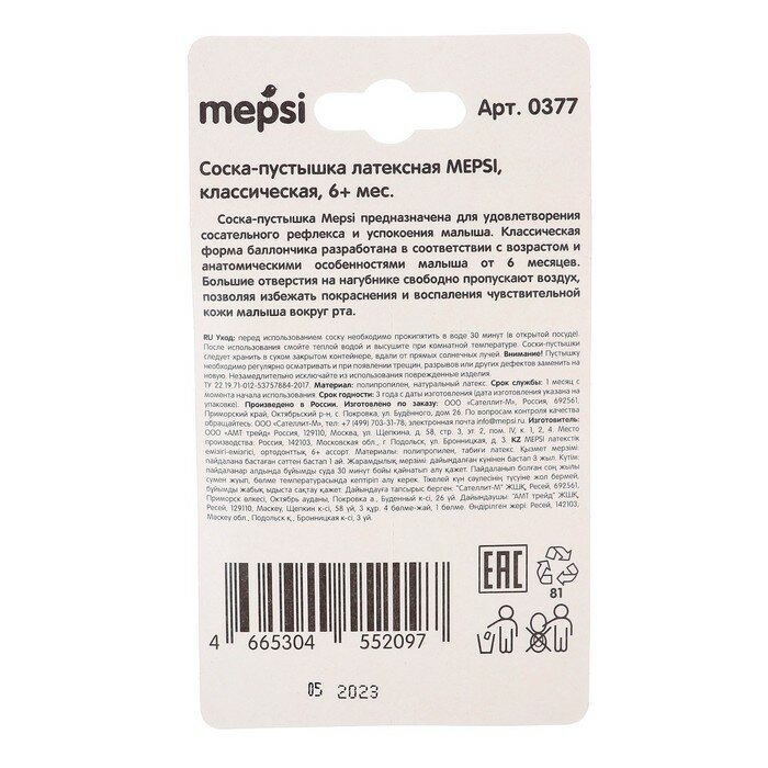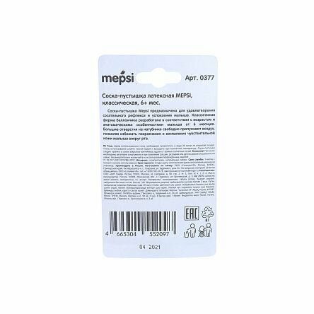 | Комплектация | Соска-пустышка Mepsi латексная классическая 1 шт. |