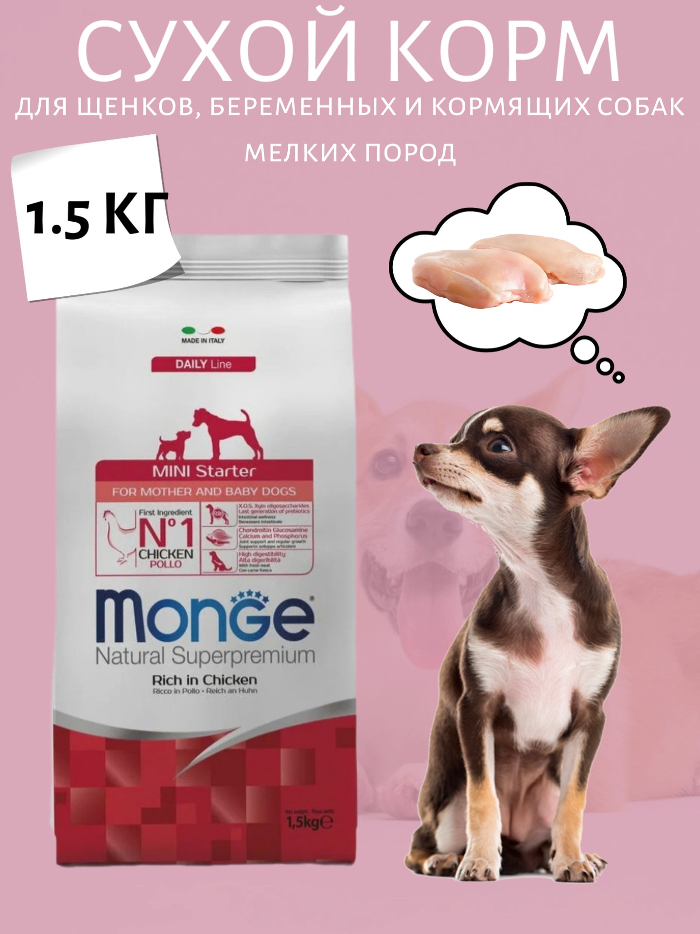 MONGE DOG MINI STARTER CHICKEN для щенков маленьких пород до 8 недель, беременных и кормящих сук с курицей (1,5 кг)