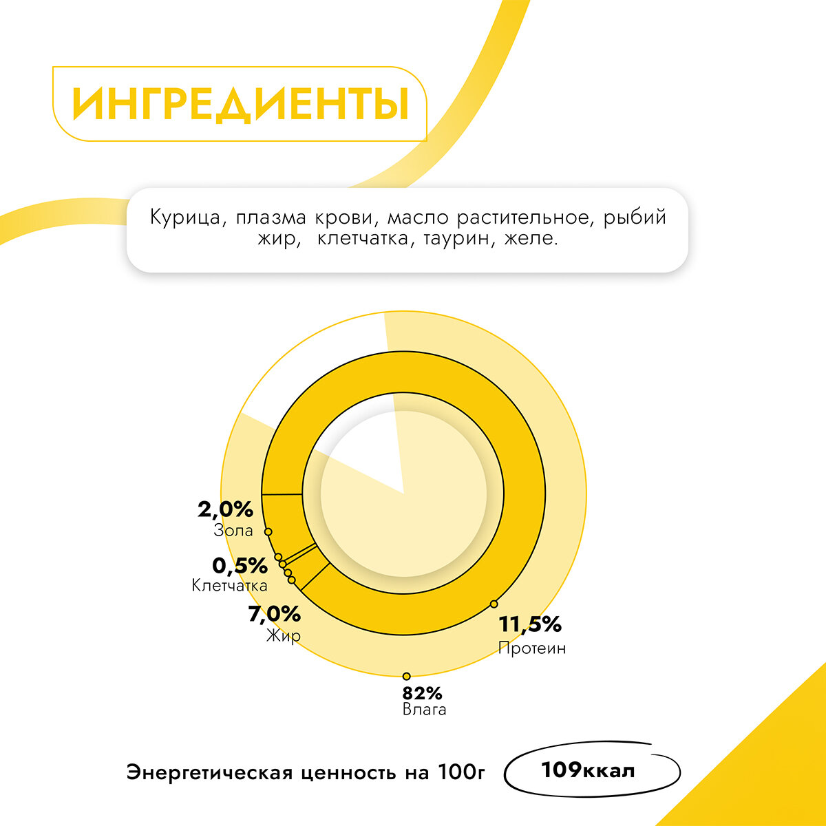 | Пищевая ценность | сырой протеин– 11,5%; сырой жир– 7,0%; сырая зола - 2,0%; клетчатка - 0,5%; таурин - 0,2%; влага –82%. |
