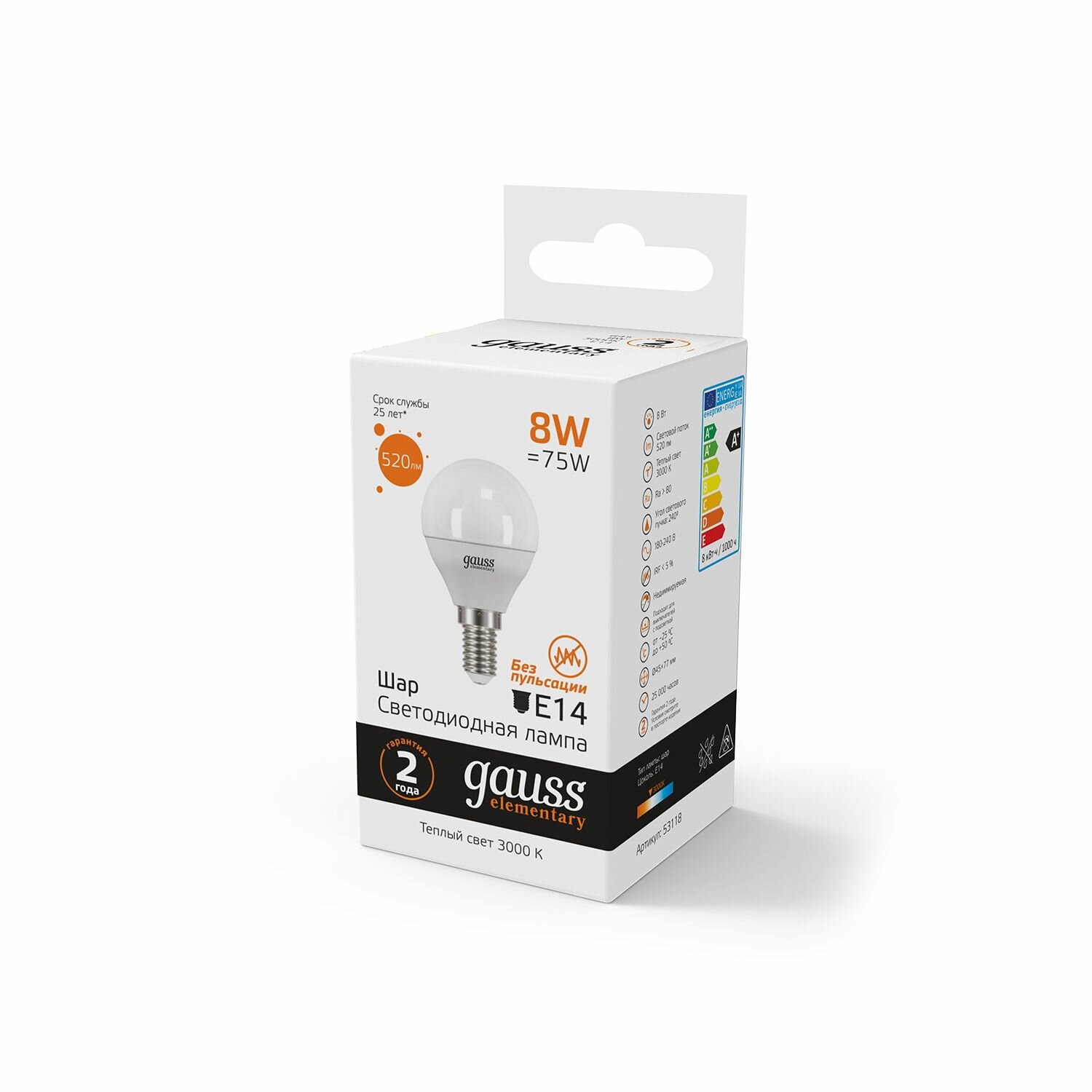 (4 шт)Лампа Gauss Elementary Шар 8W 520lm 3000K Е14 LED 1/10/100