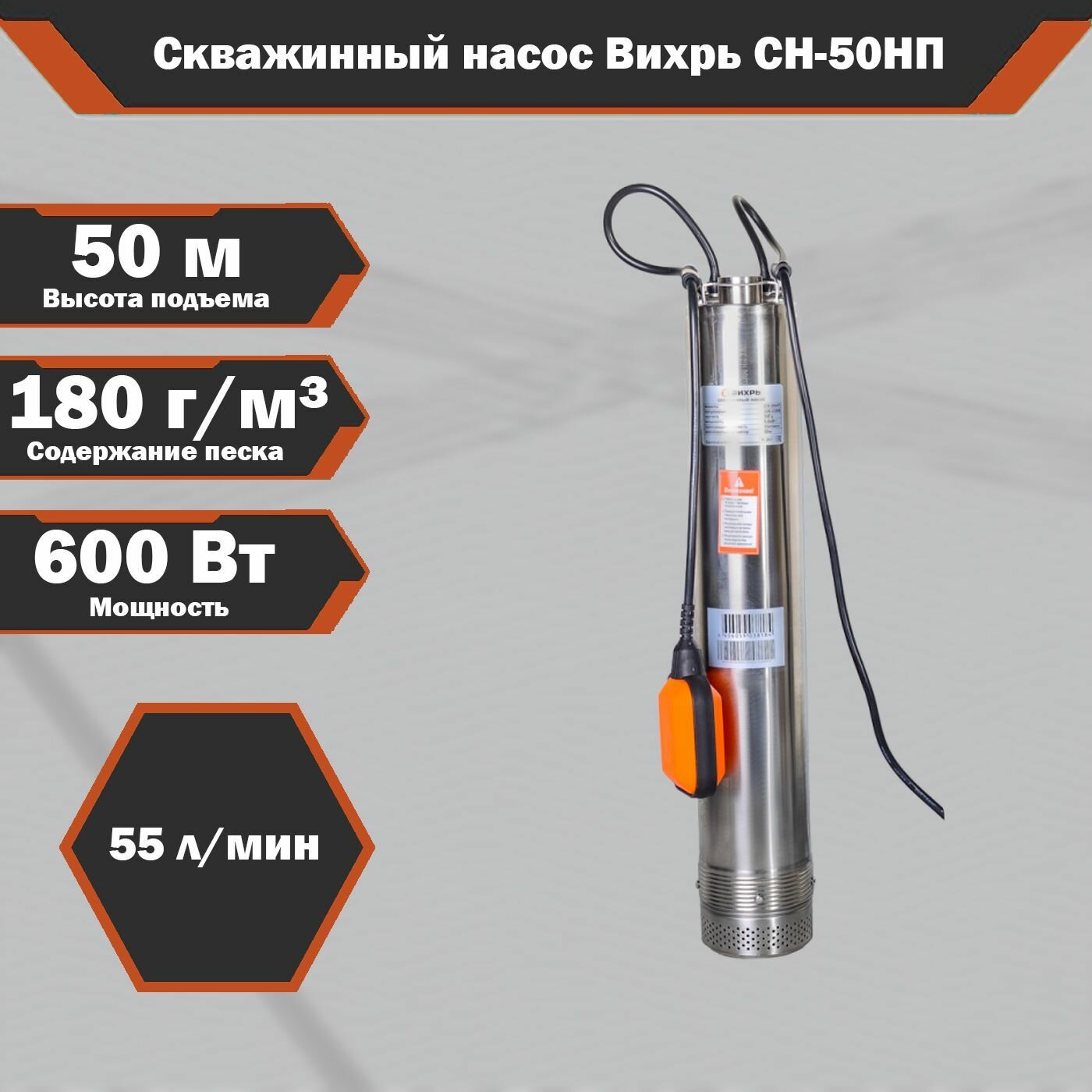 Скважинный насос Вихрь СН-50НП, 600 Вт, высота подъема – 50 м, 55 л/мин, 1”