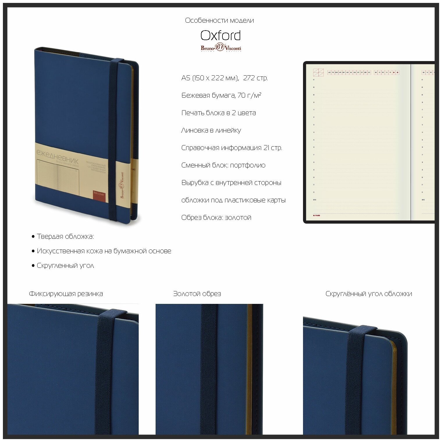 | Особенности | карман для визиток / ляссе / поля / прошивка по периметру обложки / справочная информация / цветной обрез |