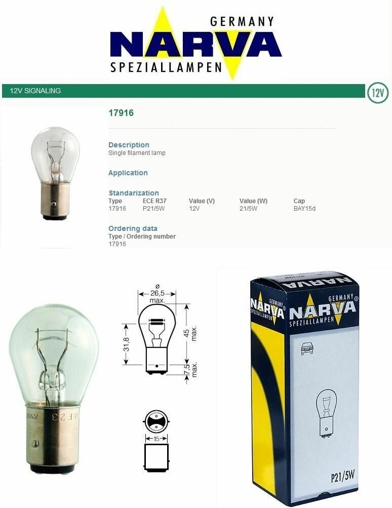 NARVA 17916 17916 P21/5W 12V 21/5W А/лампы - NARVA NARVA