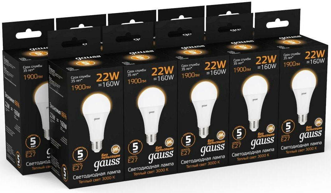 Комплект 5 штук, Лампа светодиодная Gauss 22W E27 A70 3000K 1560lm 102502122