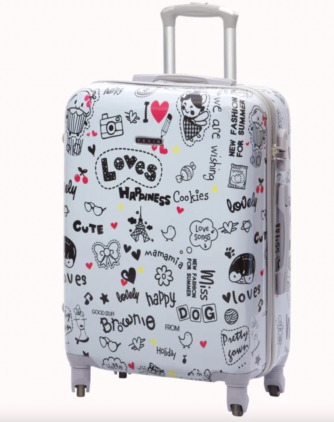 Чемодан на колесиках дорожный ручная кладь в самолет для девочки s TEVIN размер С небольшой и легкий 55 см 37 л прочный поликарбонат Белый рисунок