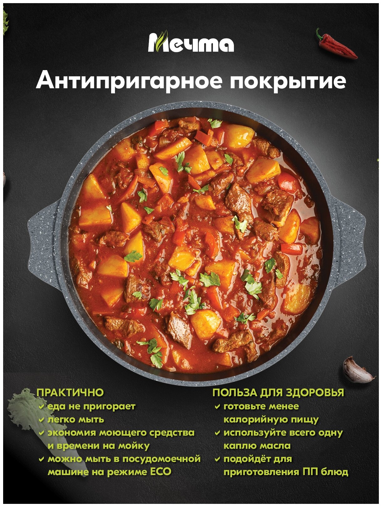 Жаровня "Мечта" 4л Гранит с антипригарным покрытием с крышкой, можно мыть в посудомоечной машине