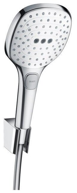 Душевая лейка Hansgrohe Raindance Select E, арт. 26720400, 3 режима, хром/белый, шланг в комплекте, упорный подшипник, шланг 160 см