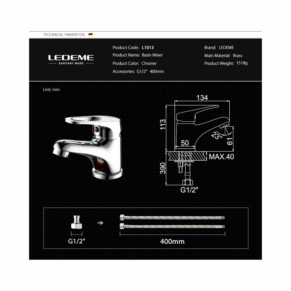 | Комплектация | смеситель; гибкая подводка; крепления |