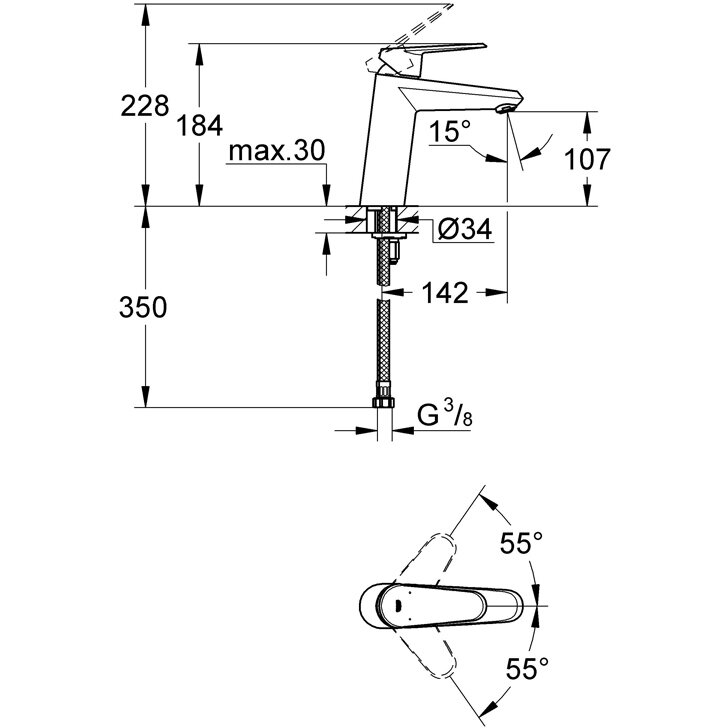 | Угол поворота рукоятки гориз. | 55 градусов |