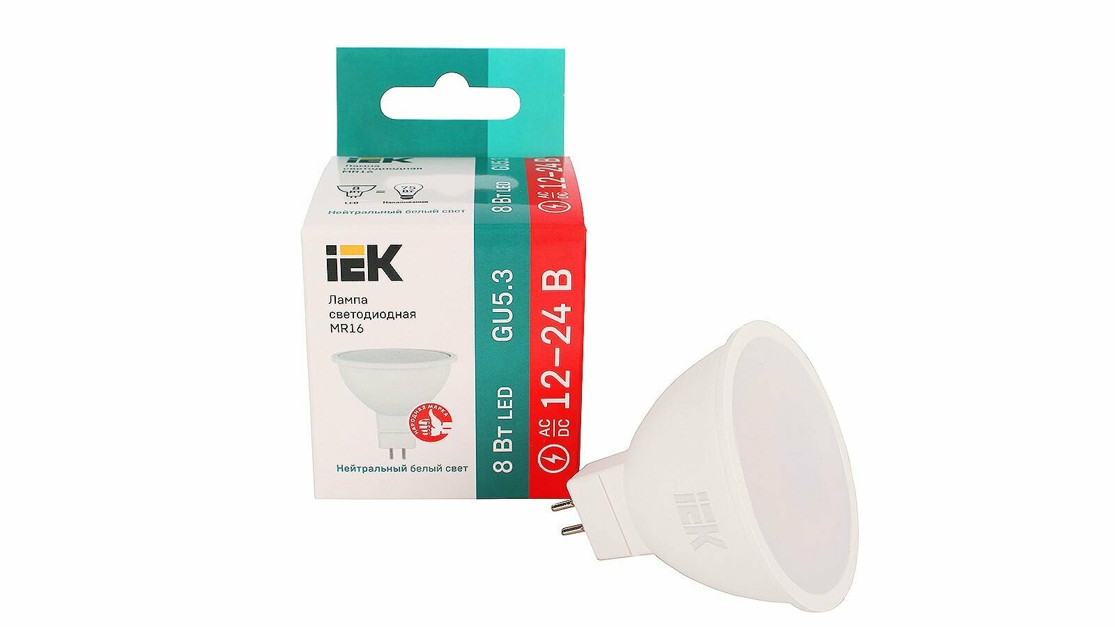 Лампа LED MR16 софит 8Вт 12-24В 4000К GU5,3, IEK LLE-MR16-08-12-24-40-GU5 (1 шт.)