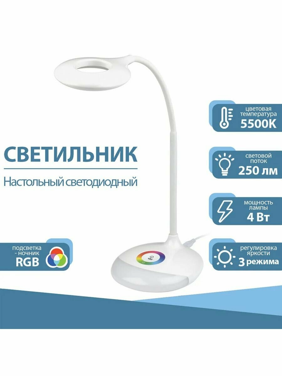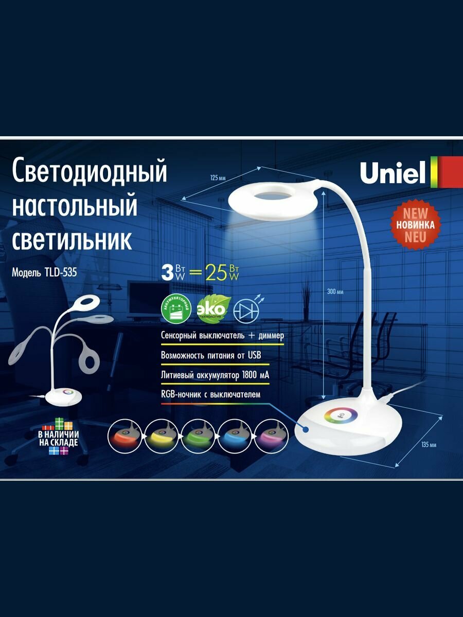 Типы/Настольные лампы/Офисные Uniel TLD-535 White/LED/250Lm/5500K/Dimmer Светильник настольный с ночником RGB, 4W. Встроенный аккумулятор 1800mAh. Сенсорный выключатель. Белый. TM Uniel.