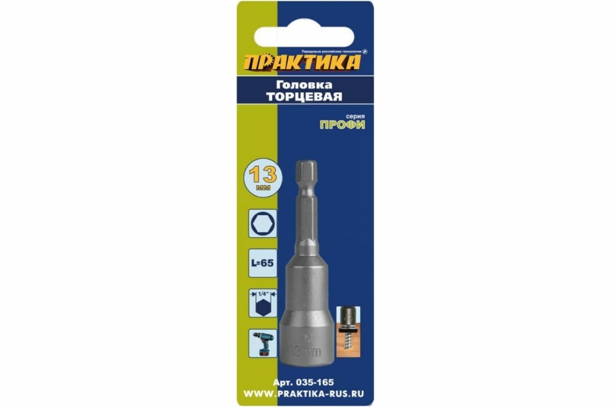 Головка гайковерта "Профи" магнитная 13 х 65 мм с хвостовиком HEX 1/4" (1шт) ПРАКТИКА 035-165