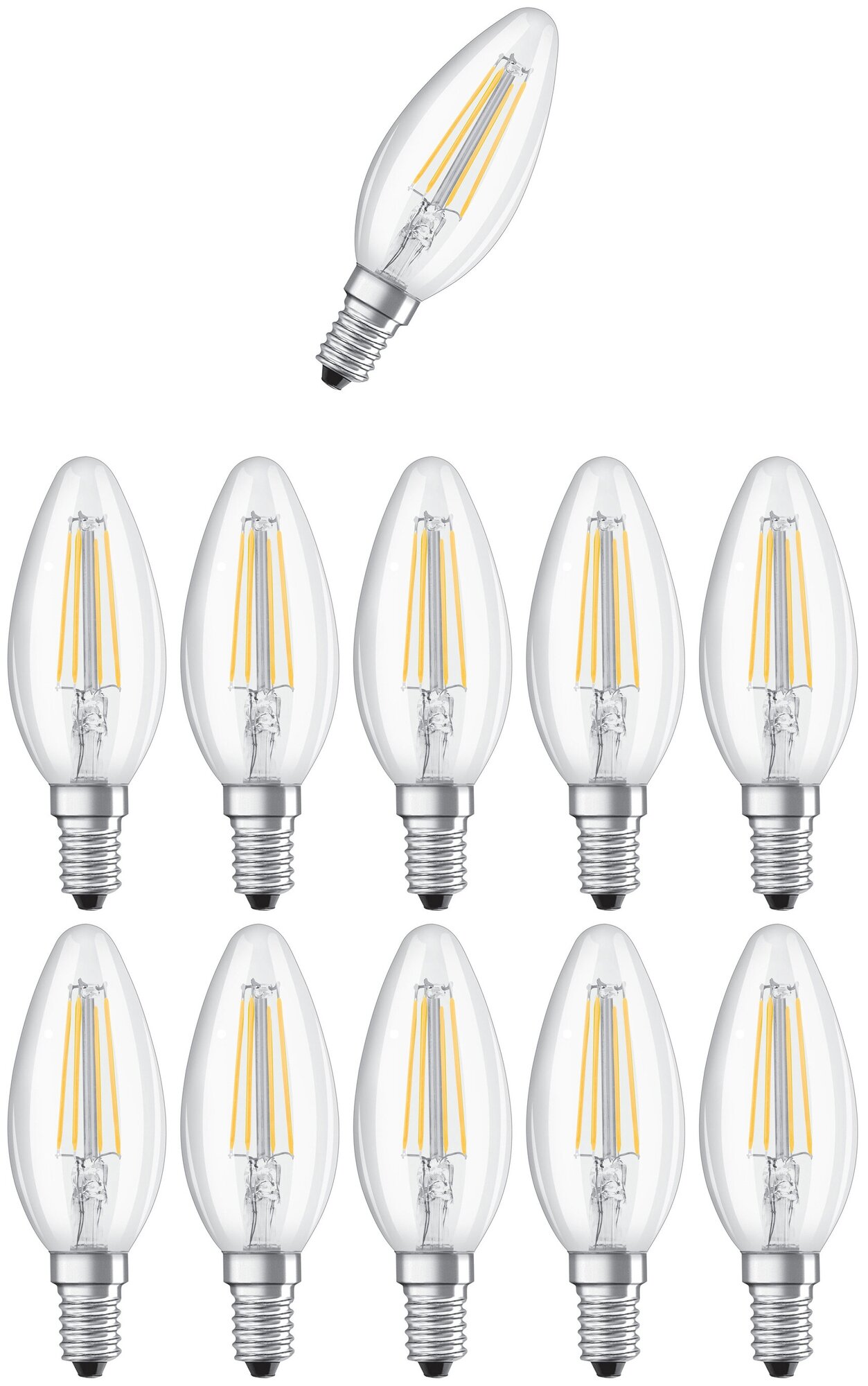 Лампочка светодиодная OSRAM Свеча B E14 6,5Вт 220В 470Лм 2700К Теплый белый Филаментная Диммируемая, упаковка 10шт