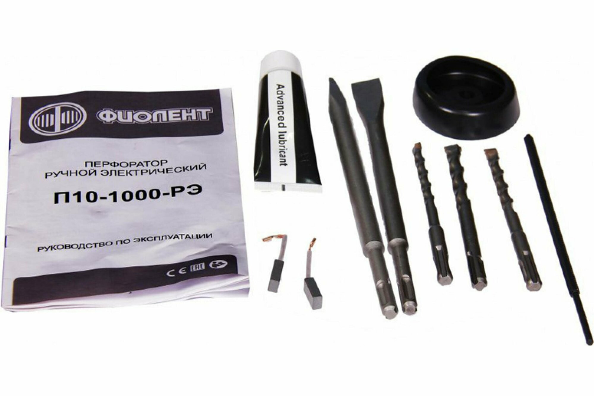 | Комплектация | перфоратор ручной электрический, пылеулавливатель, пруток, сверло (8, 10, 12 мм.), пика, зубило, смазка, кейс, дополнительный комплект щеток, руководство по эксплуатации |