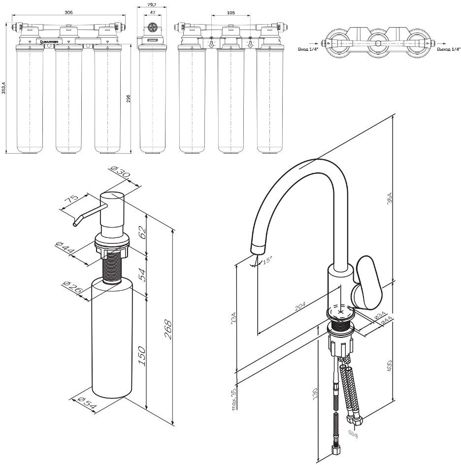 | Особенности | аэратор / Гибкая подводка / Поворотный / С фильтром для питьевой воды / Совмещенный излив для питьевой воды |