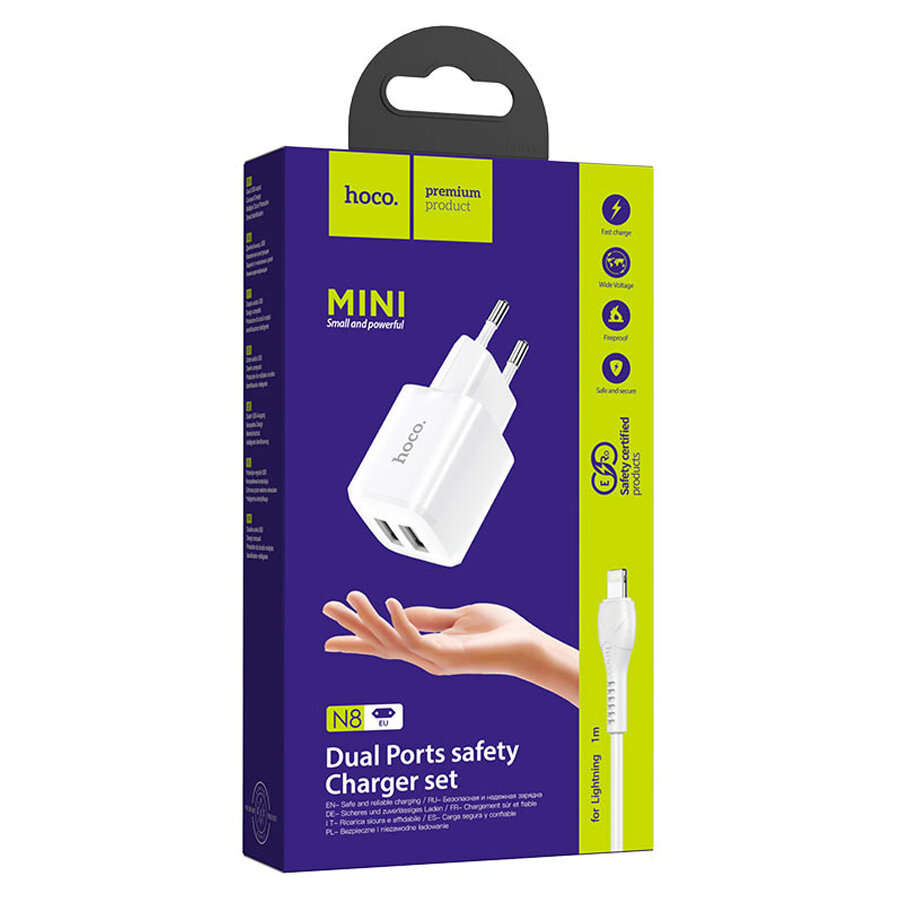 Зарядное устройство HOCO N8 Briar 2/USB + Кабель USB-Lightning, 2.4A, белый