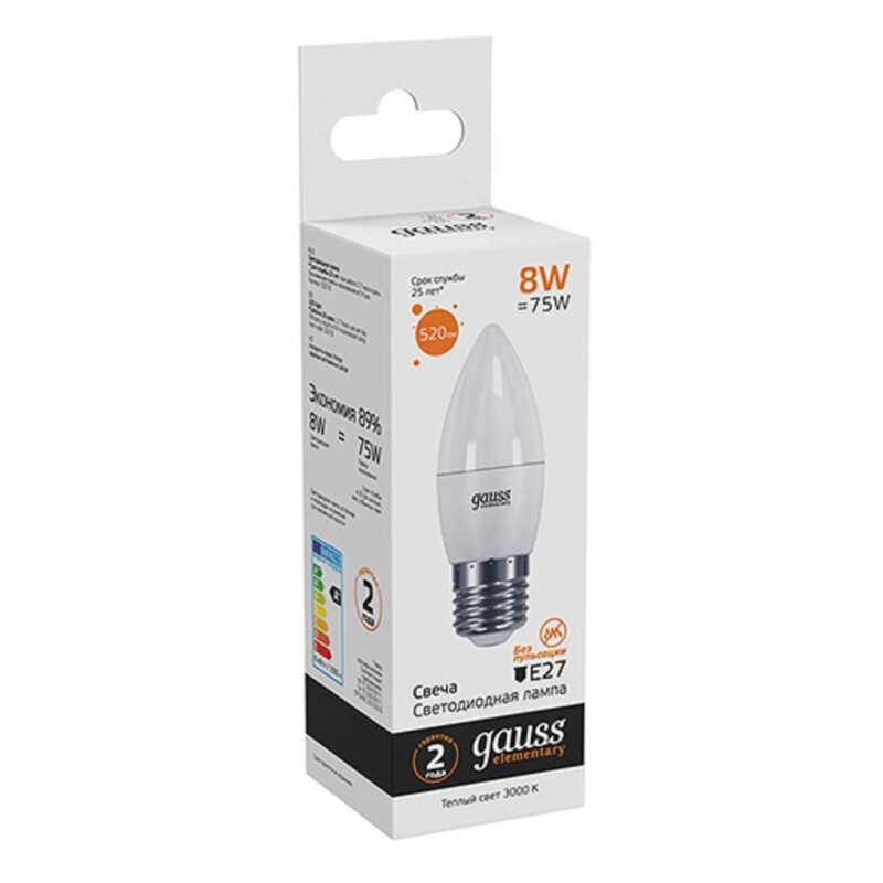 Лампа Gauss Elementary Свеча 8W 520lm 3000K Е27 LED 1/10/100 2 шт