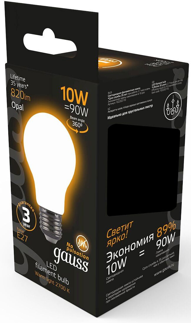 Светодиодная лампа Gauss LED Filament A60 OPAL E27 10W 2700К (упаковка 10 шт)