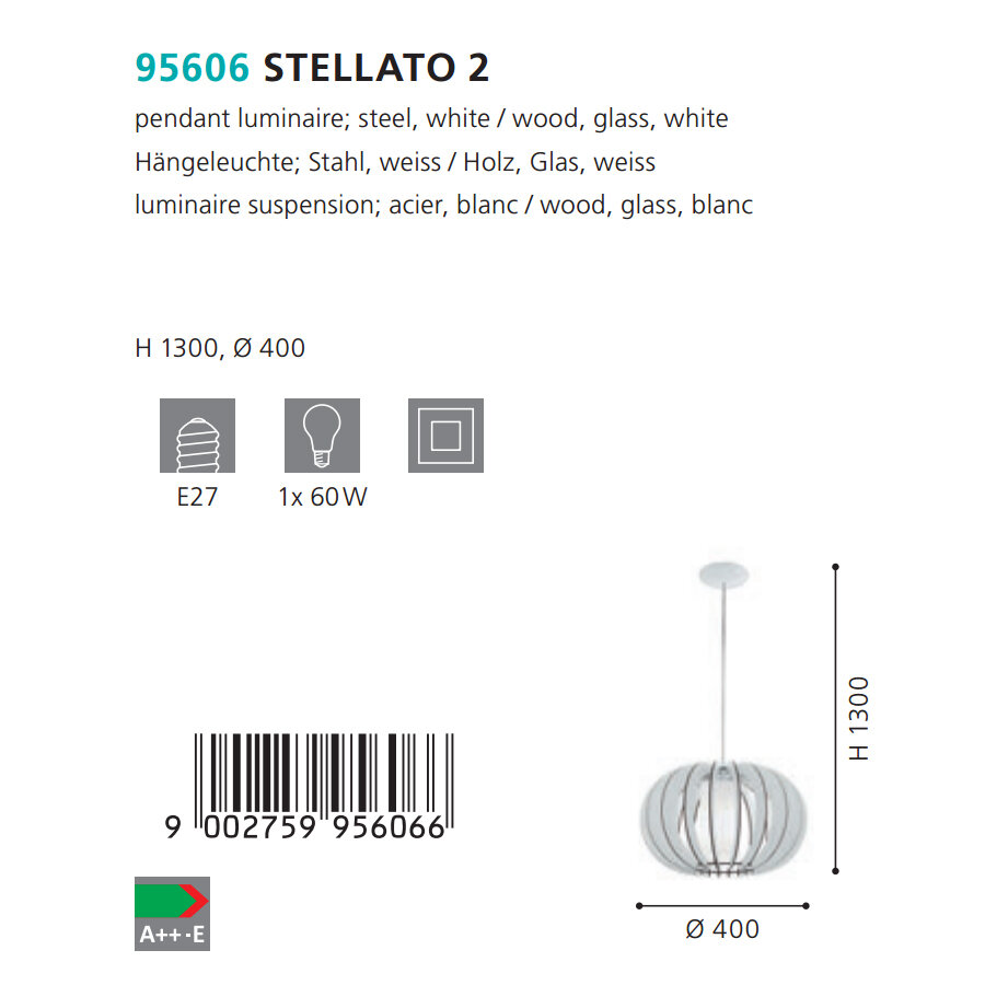 Ниже Вы можете прочитать отзывы на Светильник подвесной Eglo Stellato 2 95606, E27, 60Вт, кол-во ламп:1шт., Белый, ознакомится с подробными характеристиками, посмотреть интересные обзоры и фотографии на Светильник подвесной Eglo Stellato 2 95606, E27, 60Вт, кол-во ламп:1шт., Белый.