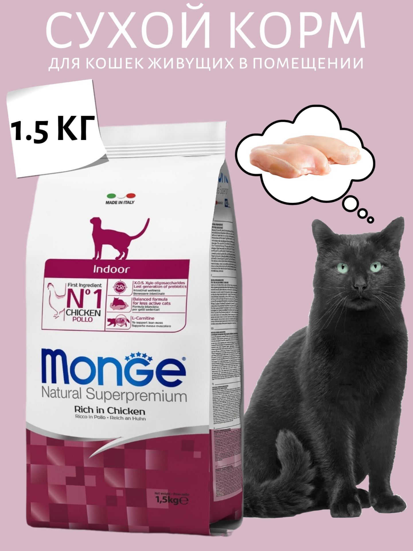 Сухой корм Monge Cat Indoor для взрослых домашних кошек, с курицей 1,5 кг