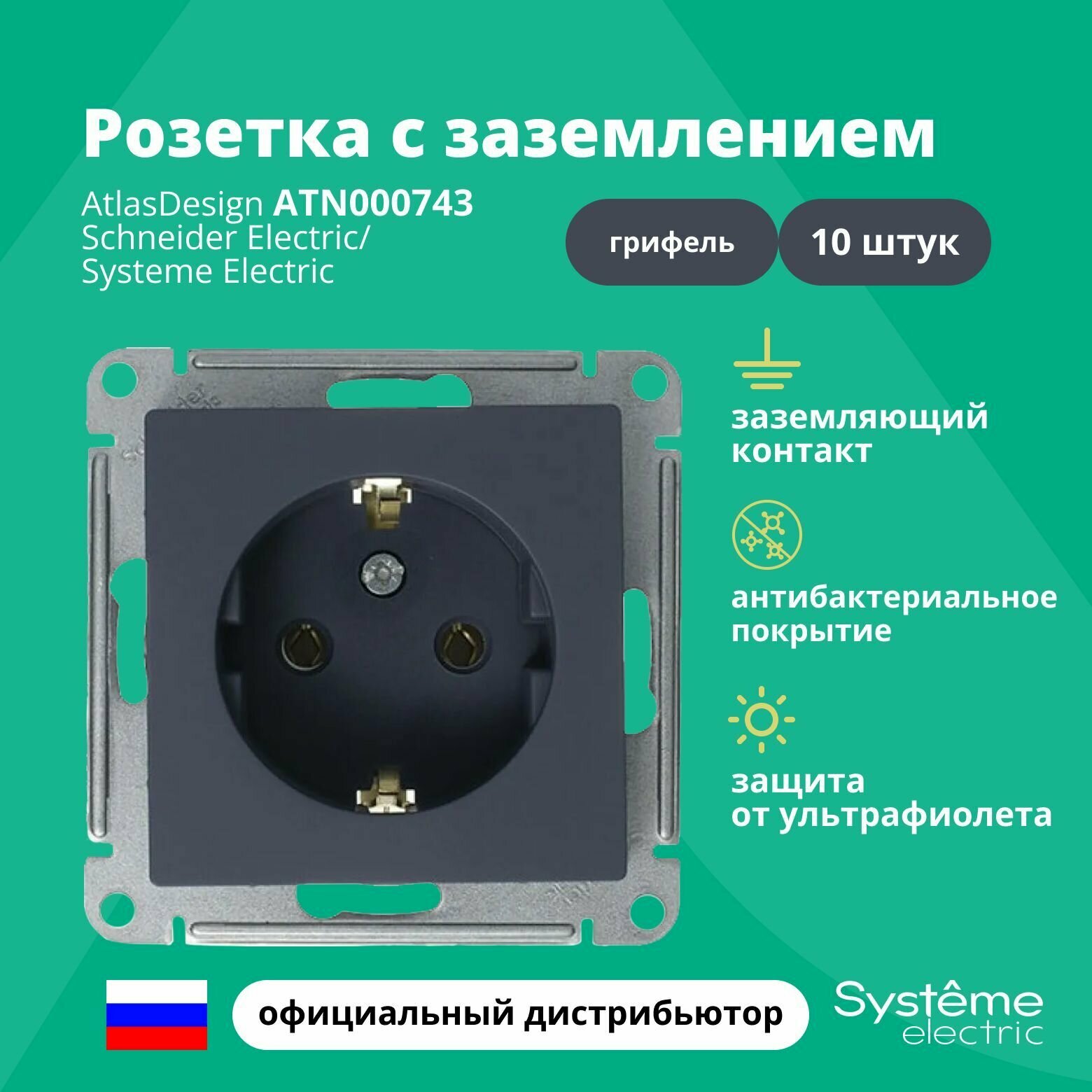 10 шт. Systeme Electric AtlasDesign Изумруд, Розетка c заземлением со шторками, 16А, механизм, ATN000845