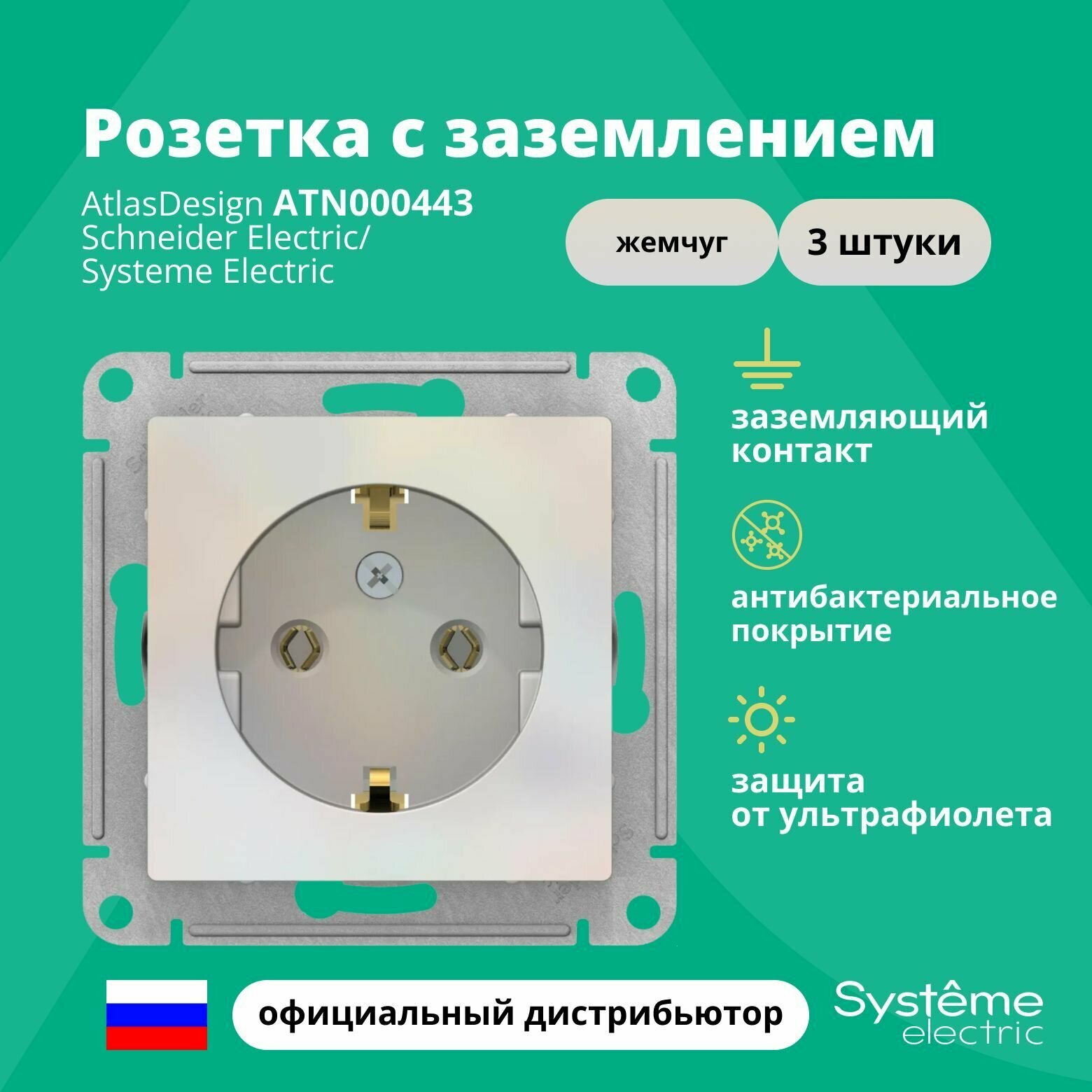 10 шт. Systeme Electric AtlasDesign Изумруд, Розетка c заземлением со шторками, 16А, механизм, ATN000845